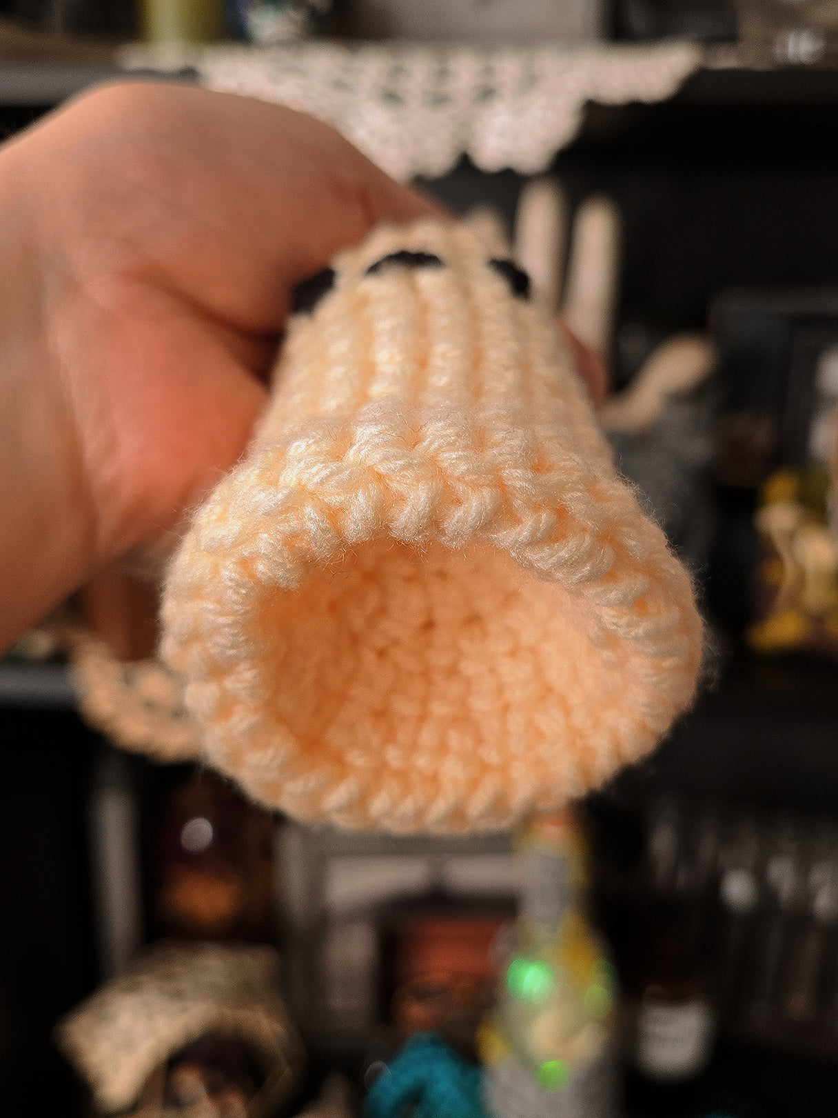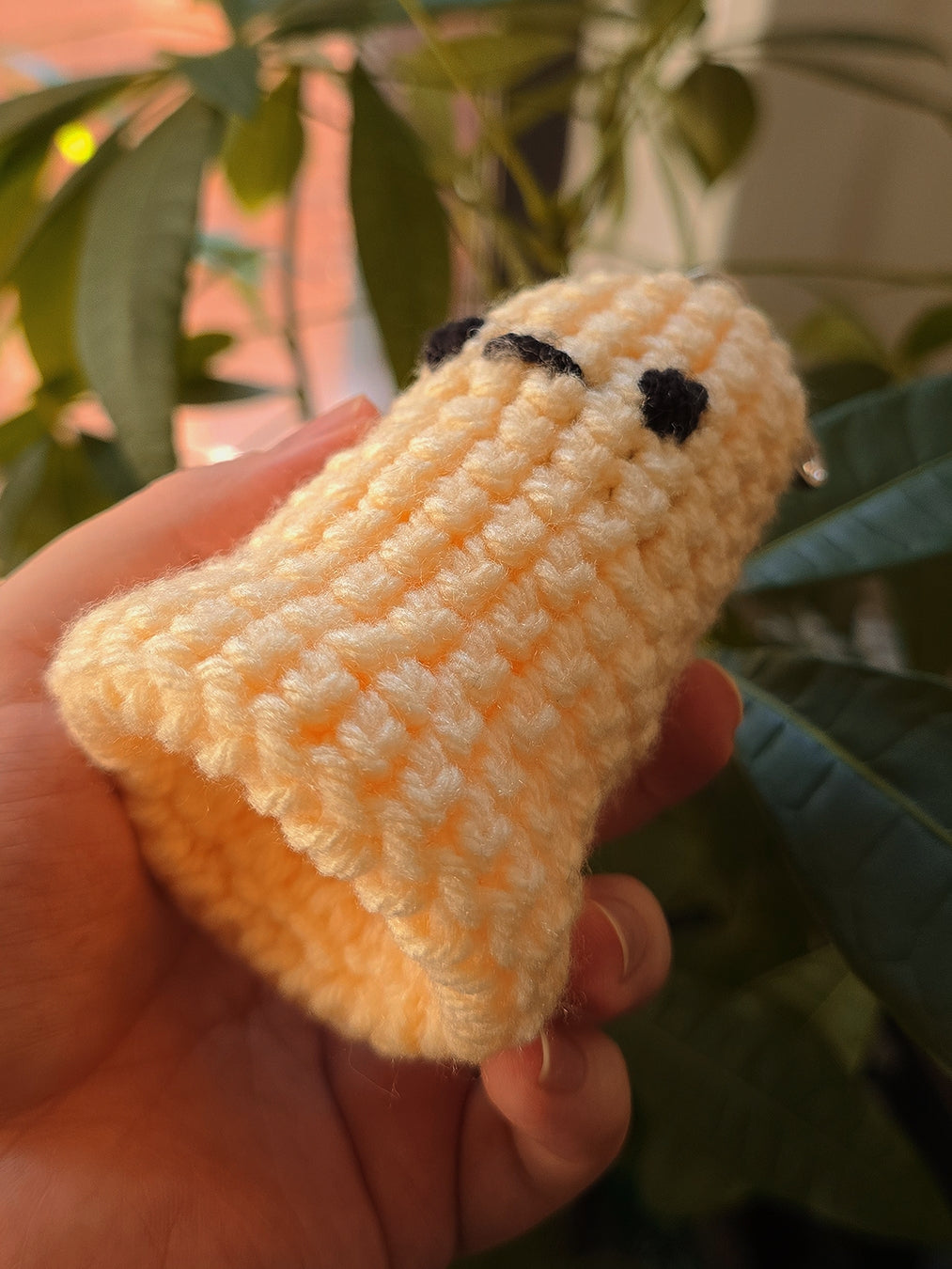 This little ghost is more sweet than spooky, with a stitched-on face that makes it a charming companion for the season (or year-round!). Handmade with tight crochet stitches, it’s lightweight and easy to carry.